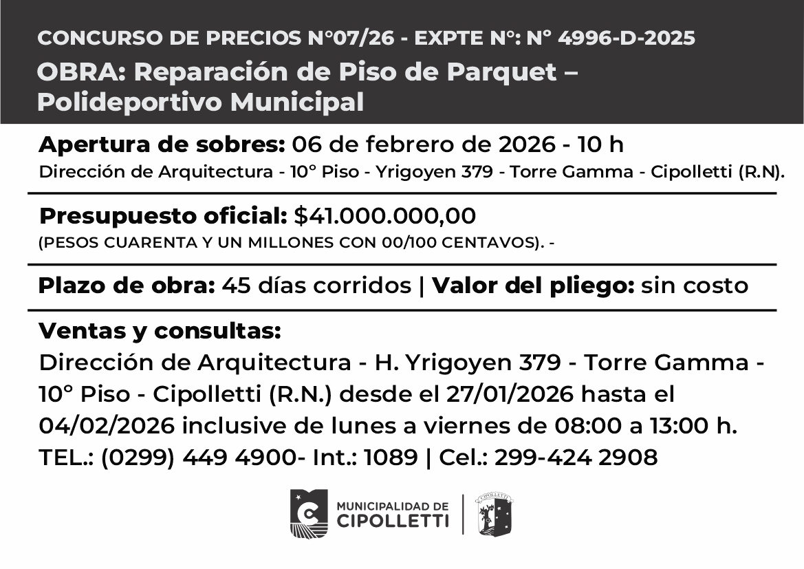 CONCURSO DE PRECIOS N°07/26 - REPARACIÓN DE PISO DE PARQUET – POLIDEPORTIVO MUNICIPAL